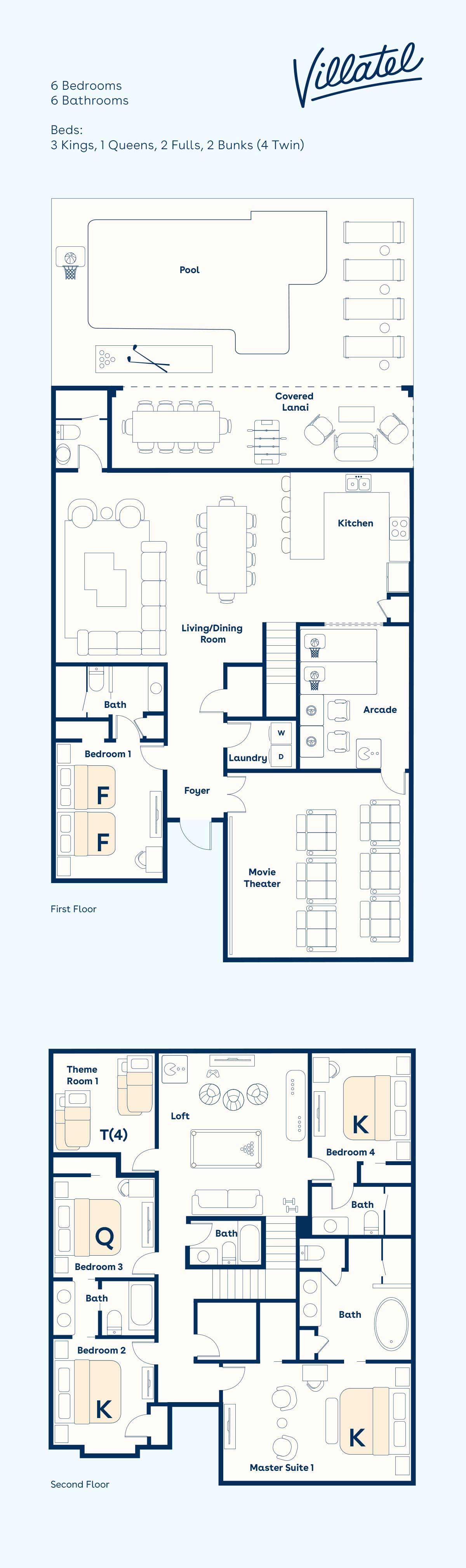 Movie Theater/ Arcade: Enjoy an epic lineup of entertainment in the privacy of your own home with this villa’s custom-built arcade and movie theater. Enjoy watching your favorite movie on the big screen while chilling in one of the deluxe, stadium-style recliner seats. Or challenge your housemates to a virtual battle in the connecting arcade where you’ll find classics like Pac-Man Baller and Air Hockey.