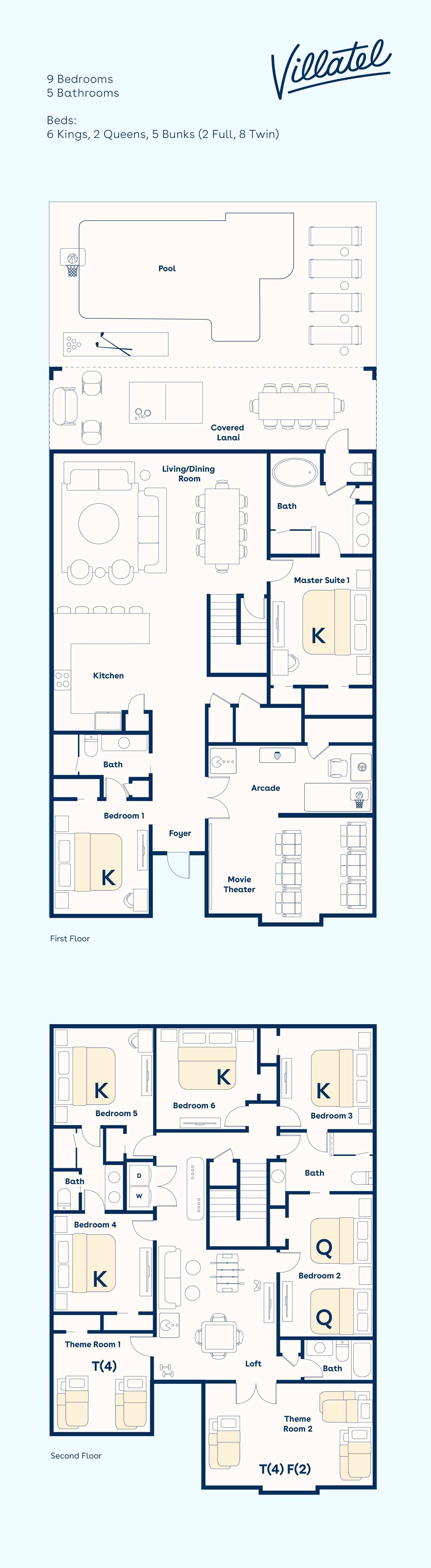 Extravagance and convenience characterize every square inch of this 9-bedroom beauty—situated at the heart of International Drive, steps from famous shopping, dining, entertainment, and minutes from all the action of Universal Orlando! But leaving the front door isn’t a requisite when everything you could need or want is built into your private retreat, from the 7 luxuriously appointed adult bedrooms, to the 2 over-the-top kids’ themed rooms, to the game loft, movie theater, arcade, and pool.