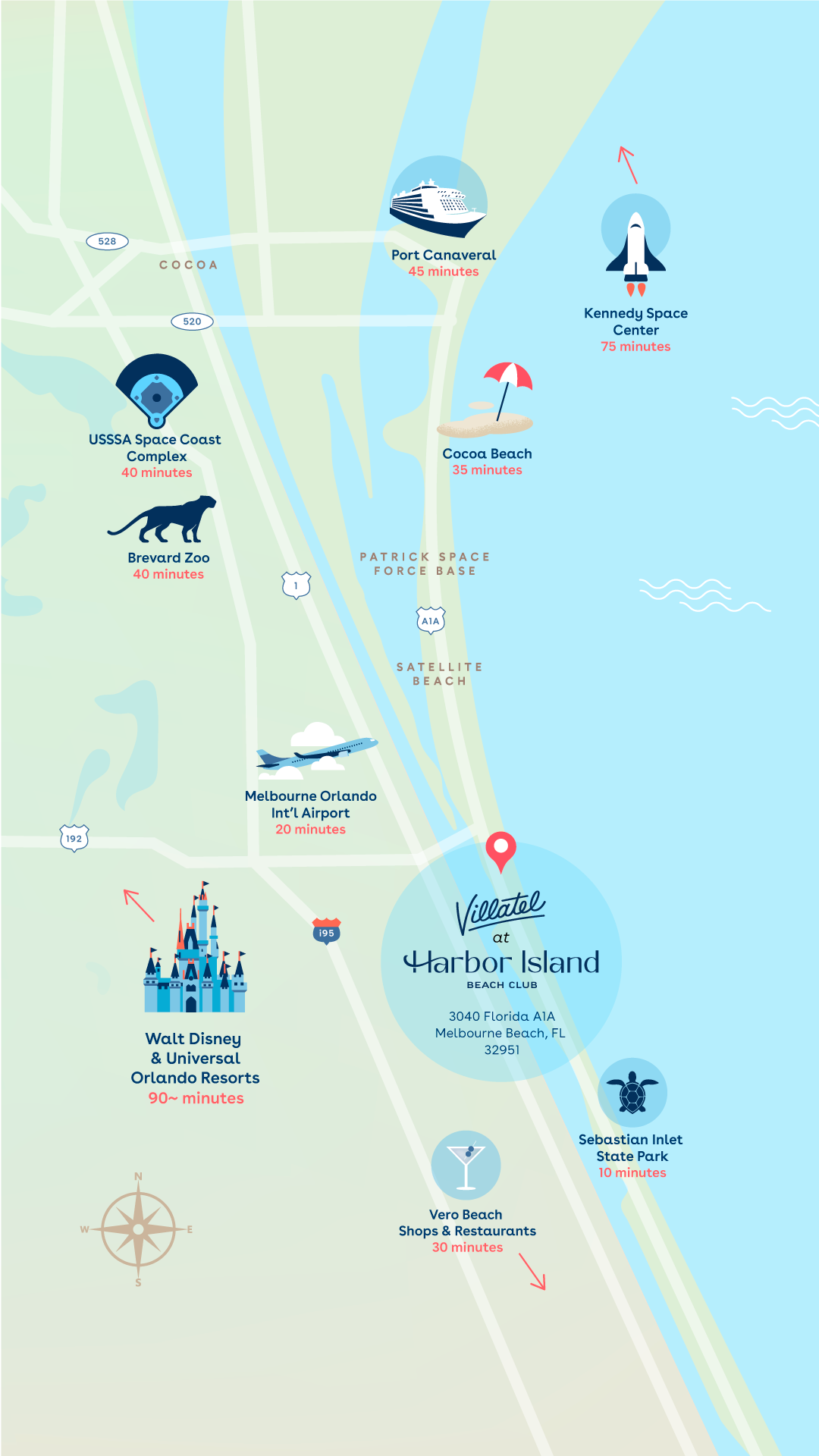 Hike, walk, bike, or drive to all the small-town spots Melbourne Beach is famous for—or get in on the action of Orlando’s big parks & attractions, 60-90 min away.