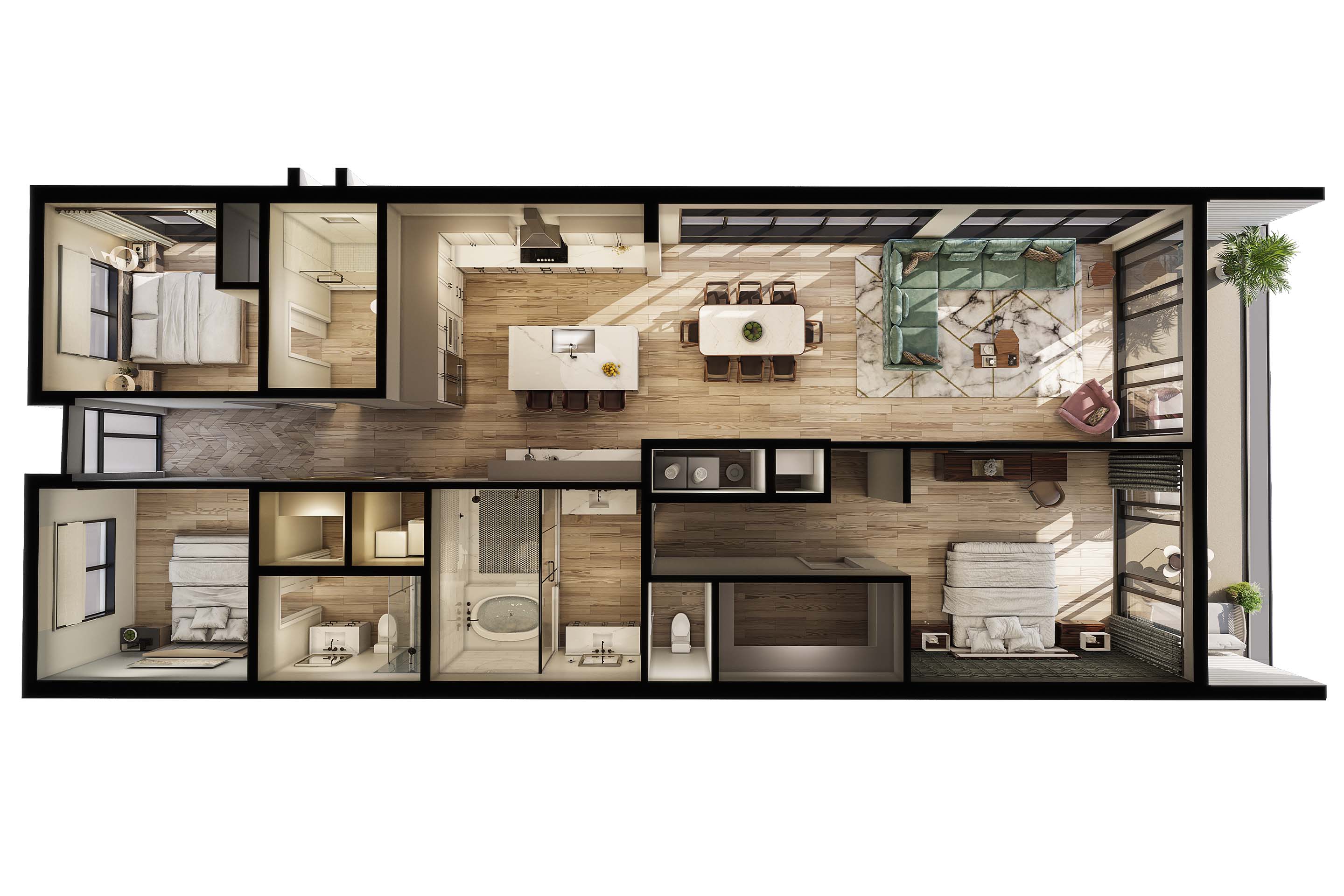 Master Bedroom: The grand master bedroom is the perfect blend of cozy and chic–featuring rich wood furniture, sleek decorative wall paneling, a massive walk-in closet, and upscale designer finishes. But we haven’t even gotten to the best part yet: a second access point to your private balcony via huge glass doors ushering in fabulous natural light. Finally, the ensuite bathroom boasts a gigantic, white marble shower and adjacent tub, plus his and her sinks, and a separate washroom.
