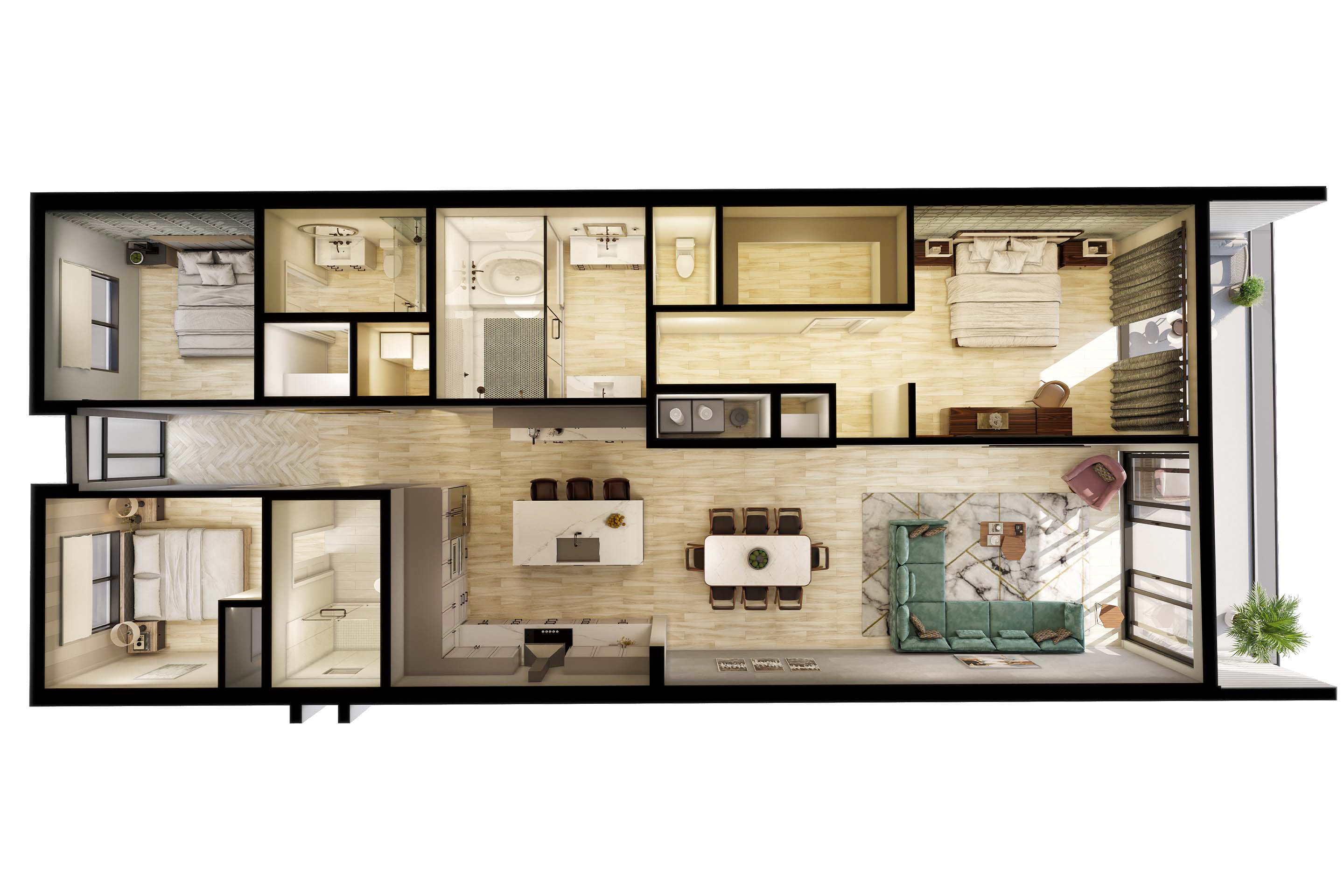Master Bedroom: The grand master bedroom exudes laidback luxury–featuring rich wood furniture, a sleek decorative accent wall, massive walk-in closet, and upscale designer finishes. But we haven’t even gotten to the best part yet: a second access point to your private balcony via huge glass doors ushering in fabulous natural light. Finally, the ensuite bathroom boasts a gigantic, white marble shower and adjacent tub, plus his and her sinks, and a separate washroom.