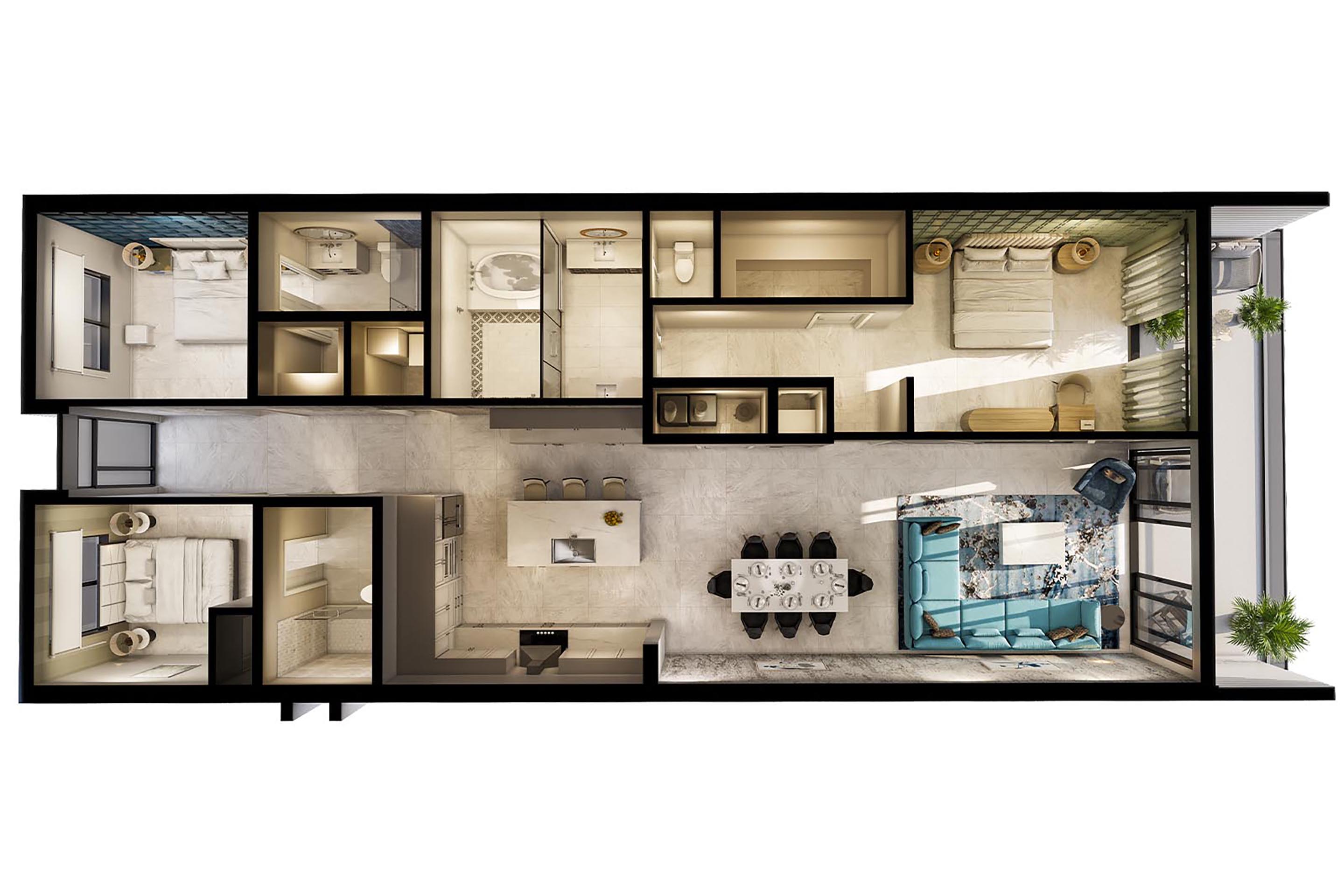 Master Bedroom: The grand master bedroom is the perfect blend of cozy and chic–featuring rich wood furniture, sleek decorative wall paneling, a massive walk-in closet, and upscale designer finishes. But we haven’t even gotten to the best part yet: a second access point to your private balcony via huge glass doors ushering in fabulous natural light. Finally, the ensuite bathroom boasts a gigantic, white marble shower and adjacent tub, plus his and her sinks, and a separate washroom.