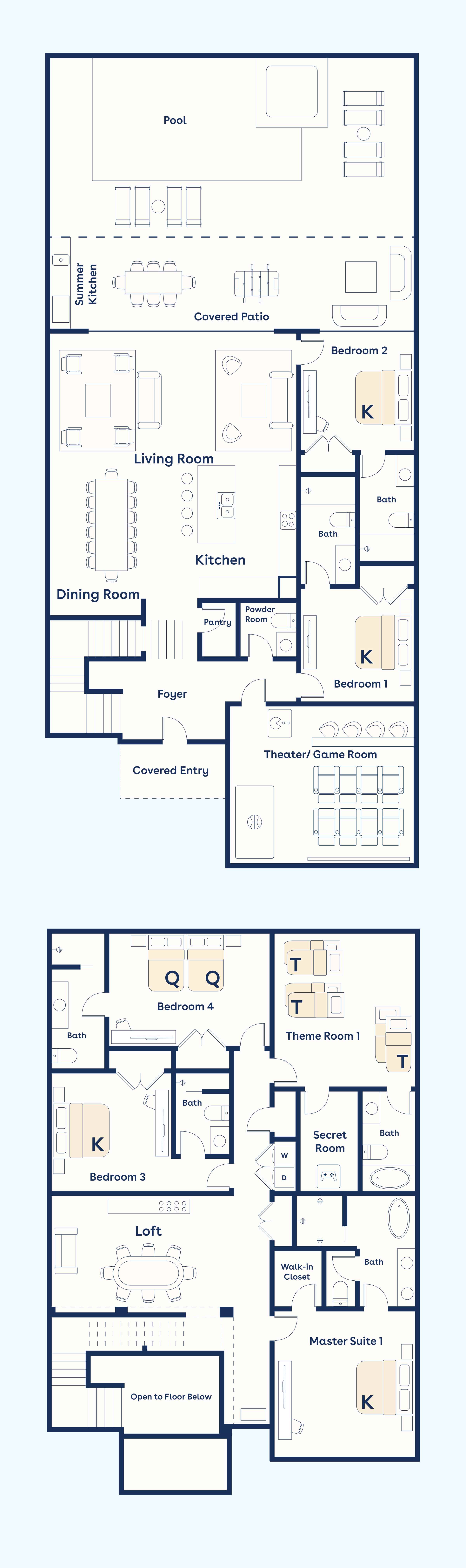 The first-floor choices include two spacious and elegant bedrooms with king-size beds and private bathrooms (one bedroom has its own private walk-out to the pool area). Upstairs, a stunning master king bedroom features high-end design, a walk-in closet, and large en suite bathroom appointed with only the best materials. Two more second-floor bedrooms beckon with king and queen-size beds, private bathrooms, and top-of-the-line amenities.