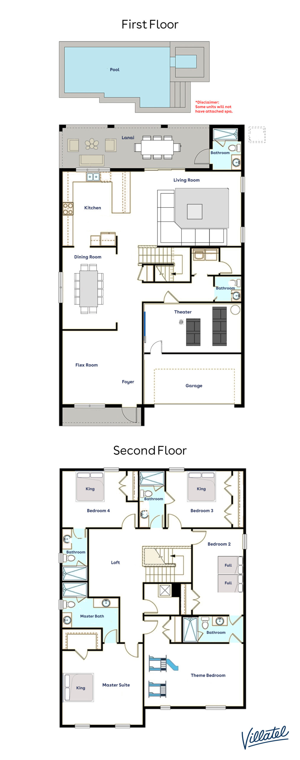 Creating the perfect vacation is easy when you’re steps from the beach and in striking distance of both Disney and all the thrills of Florida’s Space Coast. But first, settle into your private villa and admire the chic design and VIP features. You’ll hardly believe it’s all yours: a sparkling private pool and patio, chef’s kitchen, movie theater, even a custom karaoke room. For kids, the cherry on the cake is the storybook-themed bedroom and their very own arcade in the second floor loft.