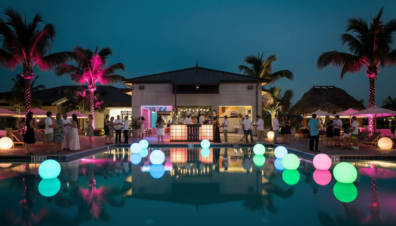 girls playing in a backyard pool in innertubes epcot dome at night