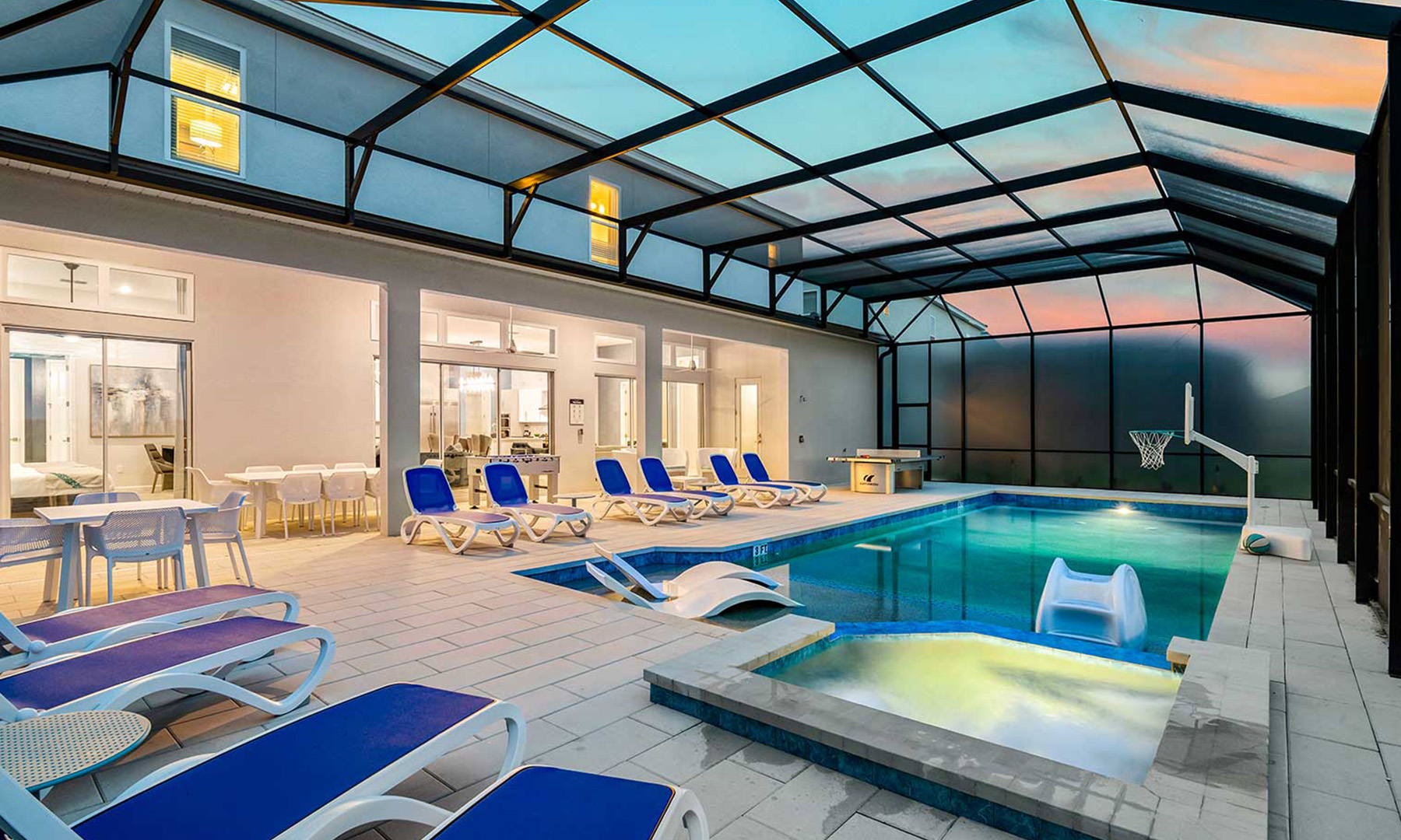 Guests have their own fully screened spa pool — with a pool basketball hoop — and hot tub. On the pool deck, there’s also a foosball table and cornhole, as well as plenty of comfy pool chairs for kicking back by the water.