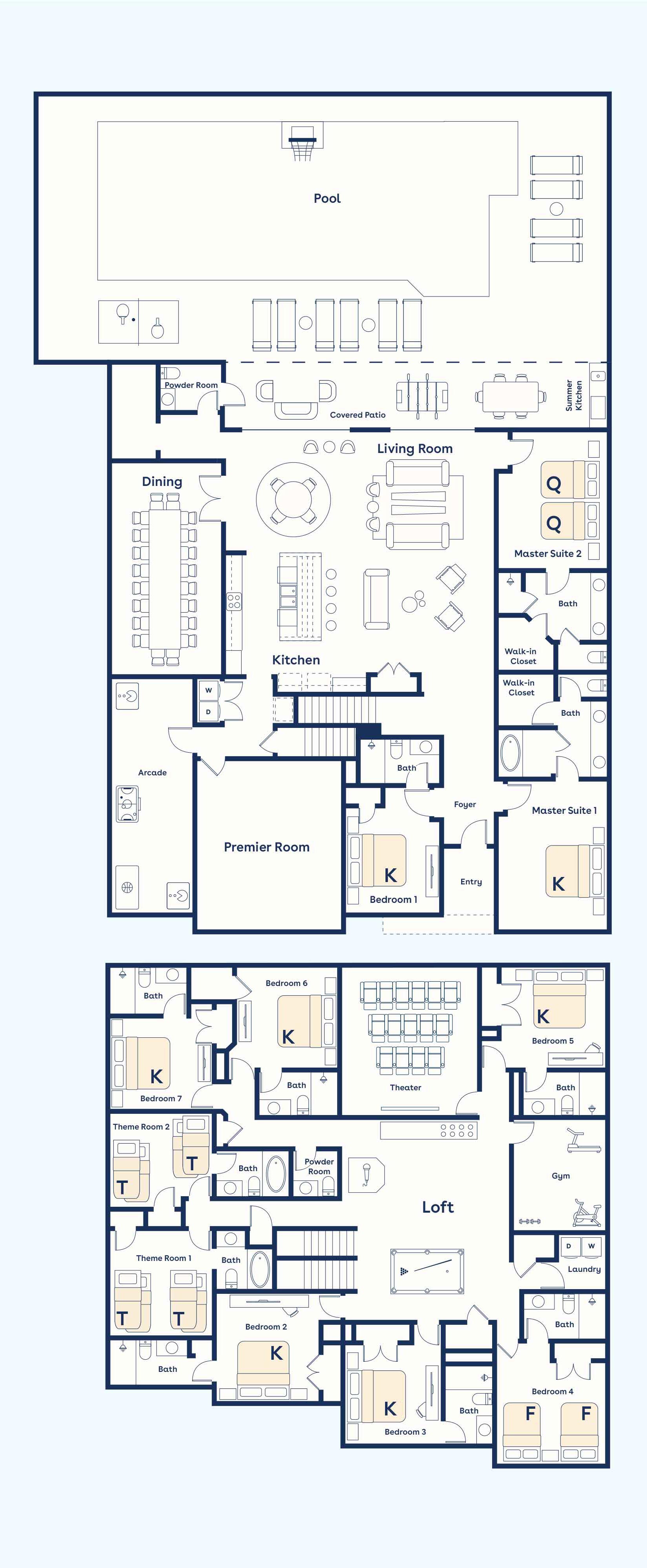 Spa-like amenities meet endless entertainment in this serene 11-bedroom stunner designed to offer you the next-level R&R you’re craving. You and your guests will luxuriate in grand living spaces, a peaceful private pool & spa, indoor and outdoor kitchens, a movie theater and arcade room, game loft, themed rooms, and more. And while you’re living like total superstars, your kids will find their happy place in the picture-perfect themed bedrooms styled after their favorite characters!