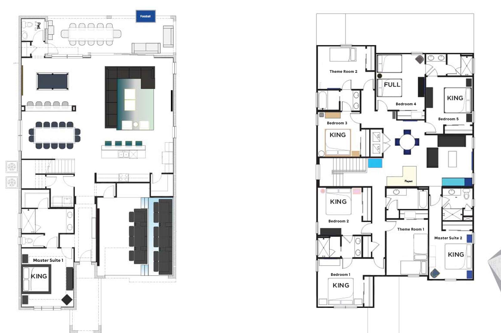 The fun continues throughout the house, starting with the private home theater on the main floor—featuring 10 ultra comfy leather recliners, led lighting, high-end projector and sound systems, and a giant projection screen. You’ll also find some great arcade games in the theater, like a Pacman multi, and Power Putt. After movie night, be sure to swing by the game room/loft, equipped with a karaoke system, arcade favorites like the Ice Ball and Fruit Ninja, a mini jungle gym for the little ones, and a lounge area with a smart TV.